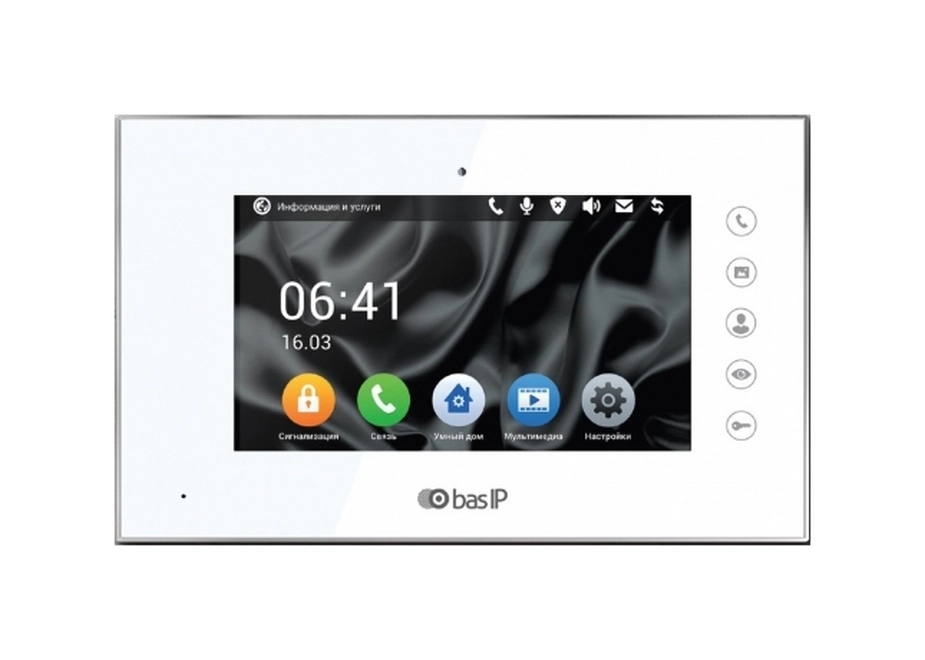 Видеодомофон BAS-IP AQ-07 W v4. IP монитор BAS-IP AQ-07 W v4 индивидуальный Touch Screen 7", c памятью на SD карту, на базе ОС Android, с возможностью подключения системы безопасности, интерком между домофонами, фоторамка, проигрыватель видеофайлов, подключение до 16 IP-камер, умный дом (контроль света, кондиционера, управление шторами). Поддержка SIP P2P. Питание 12 В DC, PoE. Цвет - белый. Дисплей сенсорный. Внутренняя память на 100 кадров, запись видео и звука на SD карту. Подключение кнопки звонка, управляемый выход при поступлении входящего звонка, возможность установки сторонних приложений. Настенная накладная установка. Корпус - пластик и металл. Размеры 234 x 144 x 18 мм.