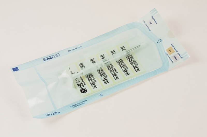 Комплект: Одноразовый шприц с электронной меткой, 7 самоклеющихся этикеток со штрихкодом и номером метки для вклейки в бумажные документы, стерильная упаковка.